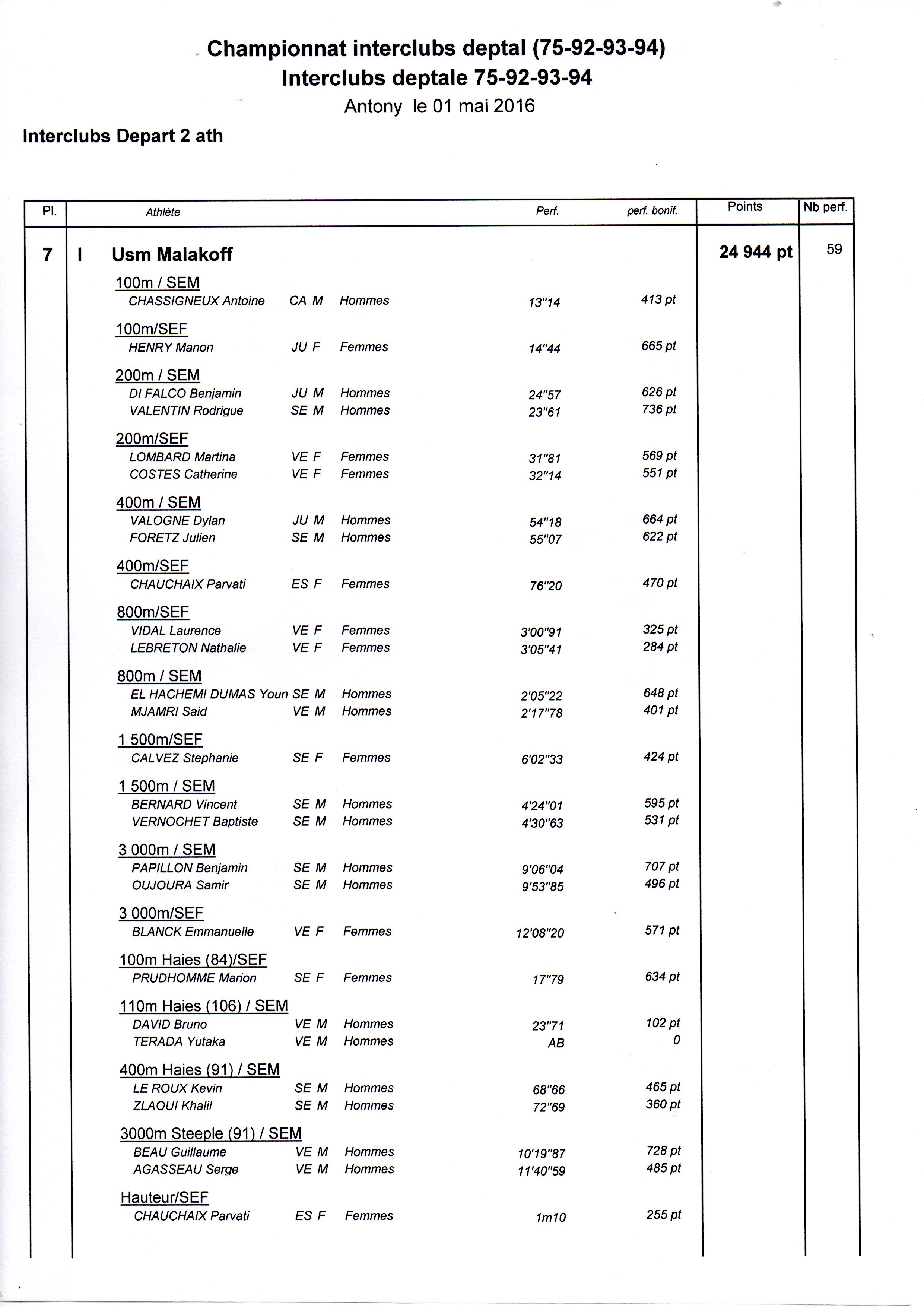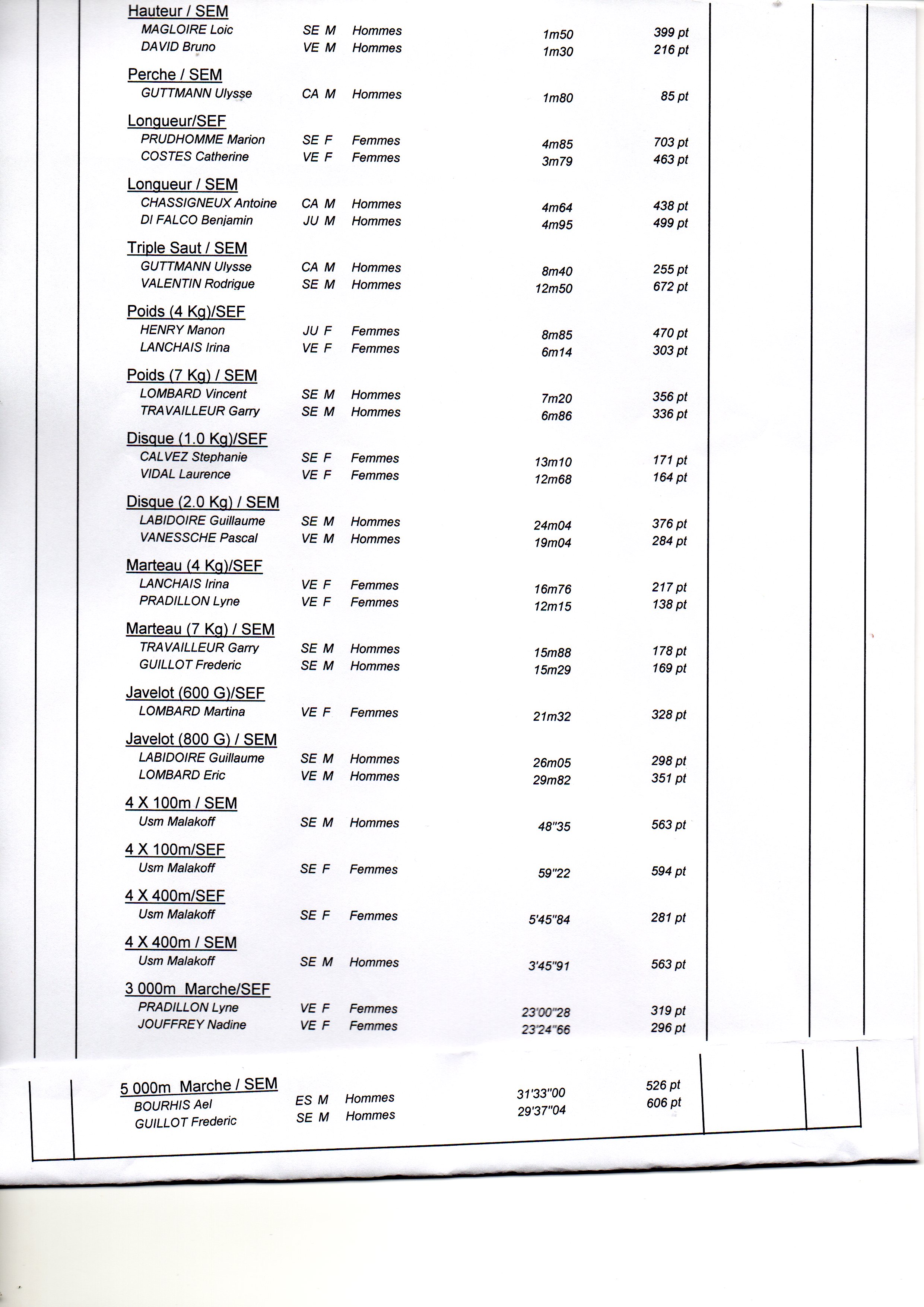 De très bonnes performances avec 4 athlètes au dessus de 700 points (Marion, Rodrigue, Benjamin et Guillaume). Mais aussi beaucoup d’abnégation pour ramener quelques points dans des épreuves parfois abordées pour la 1re fois et sans préparation. Ainsi nos marathoniennes qui n’ont pas hésité à remplacer les titulaires sur 4x400 (Nathalie, Lyne, Nadine) ou même 4x100 (Laurence). Et pour tous, le dépassement de soi jusqu’au franchissement de la ligne d’arrivée pour gagner quelques points supplémentaires. Un grand bravo à tous, vous avez été admirables.
